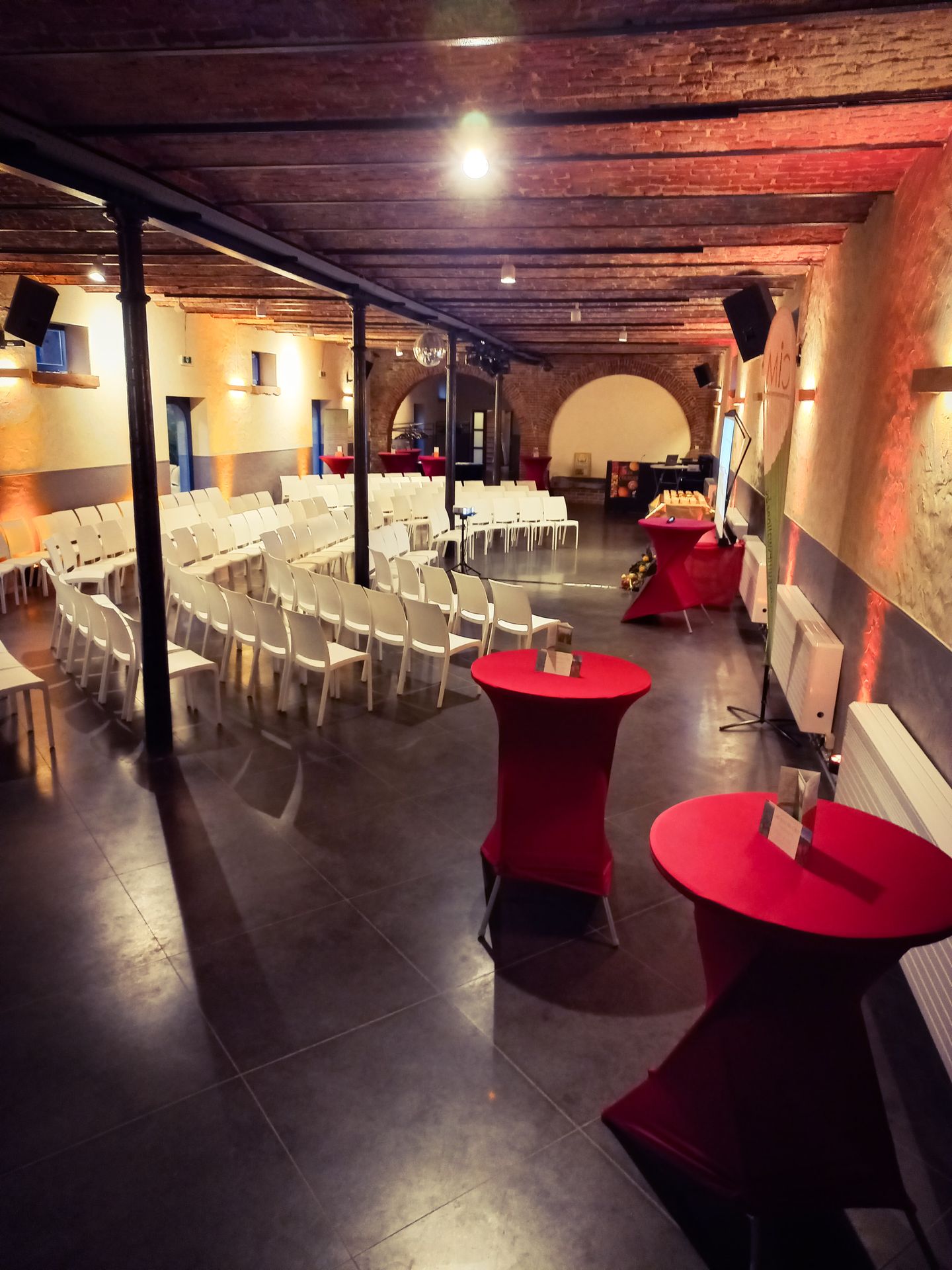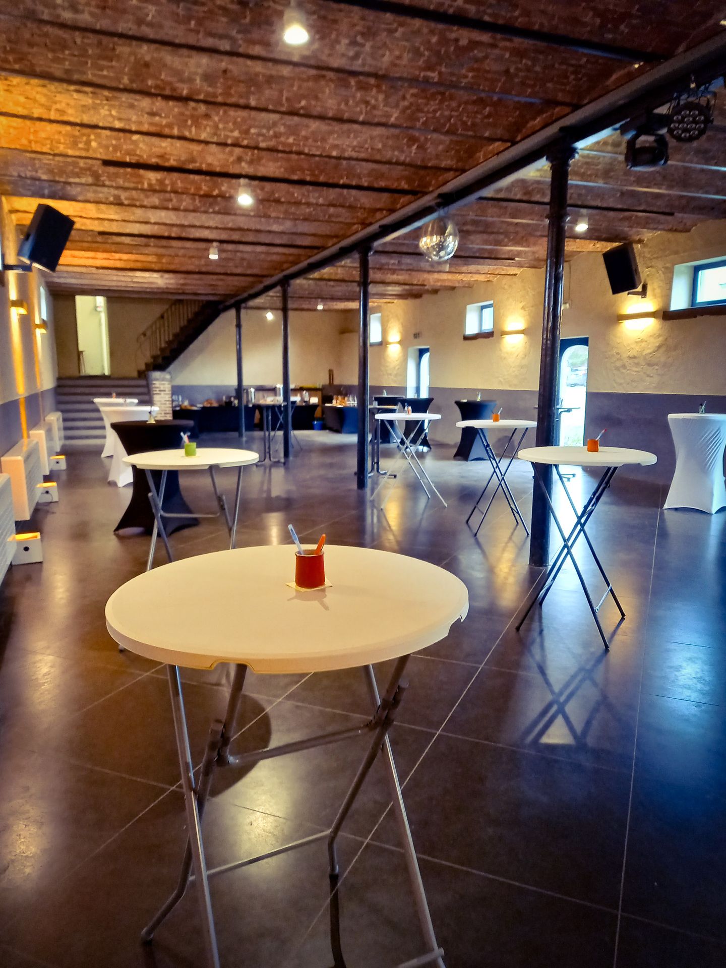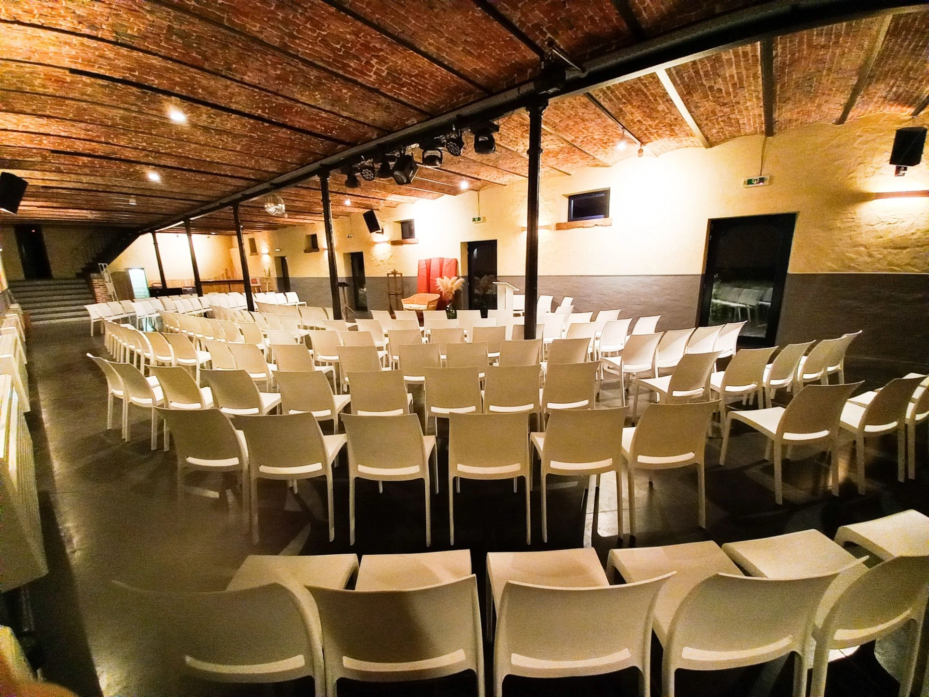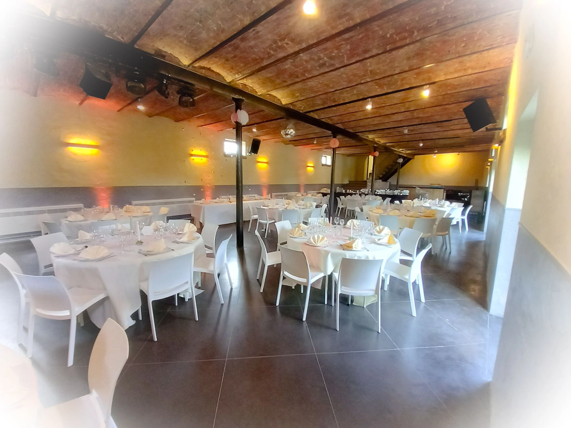 A l'étage, un rétroprojecteur, un écran de projection, des micros sans fil, des baffles et des spots de couleur vous permettent de créer une atmosphère