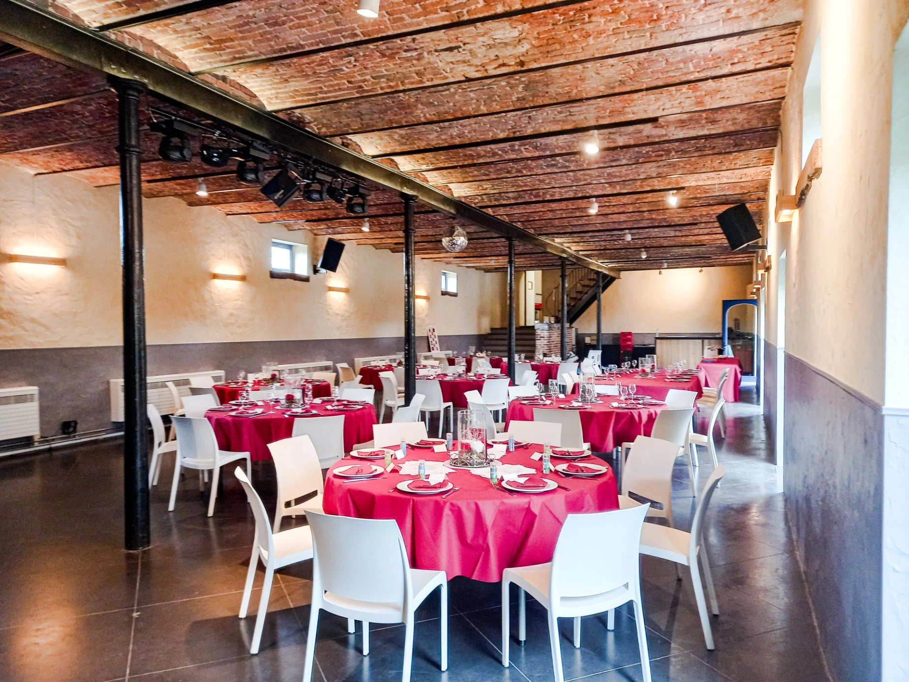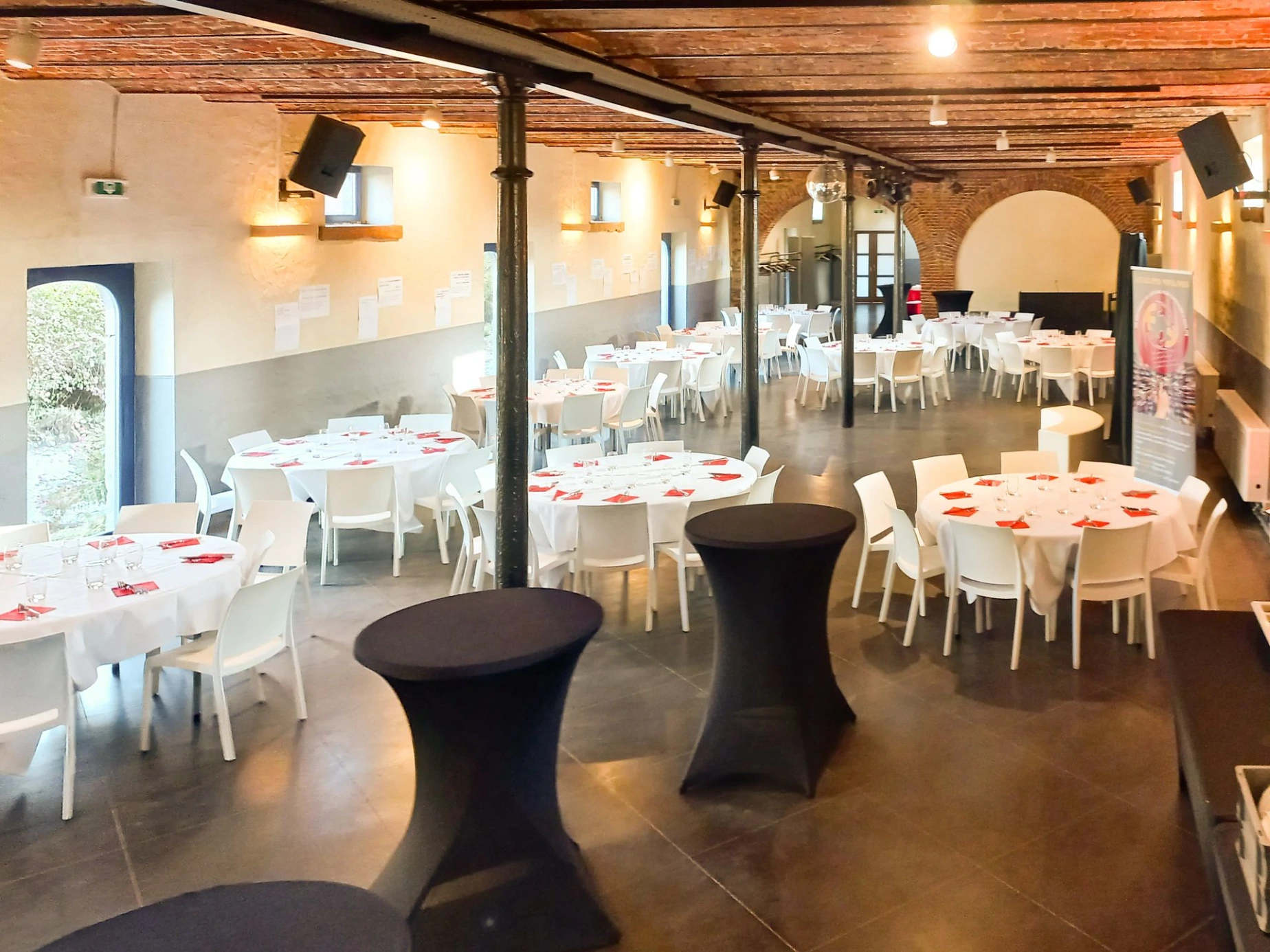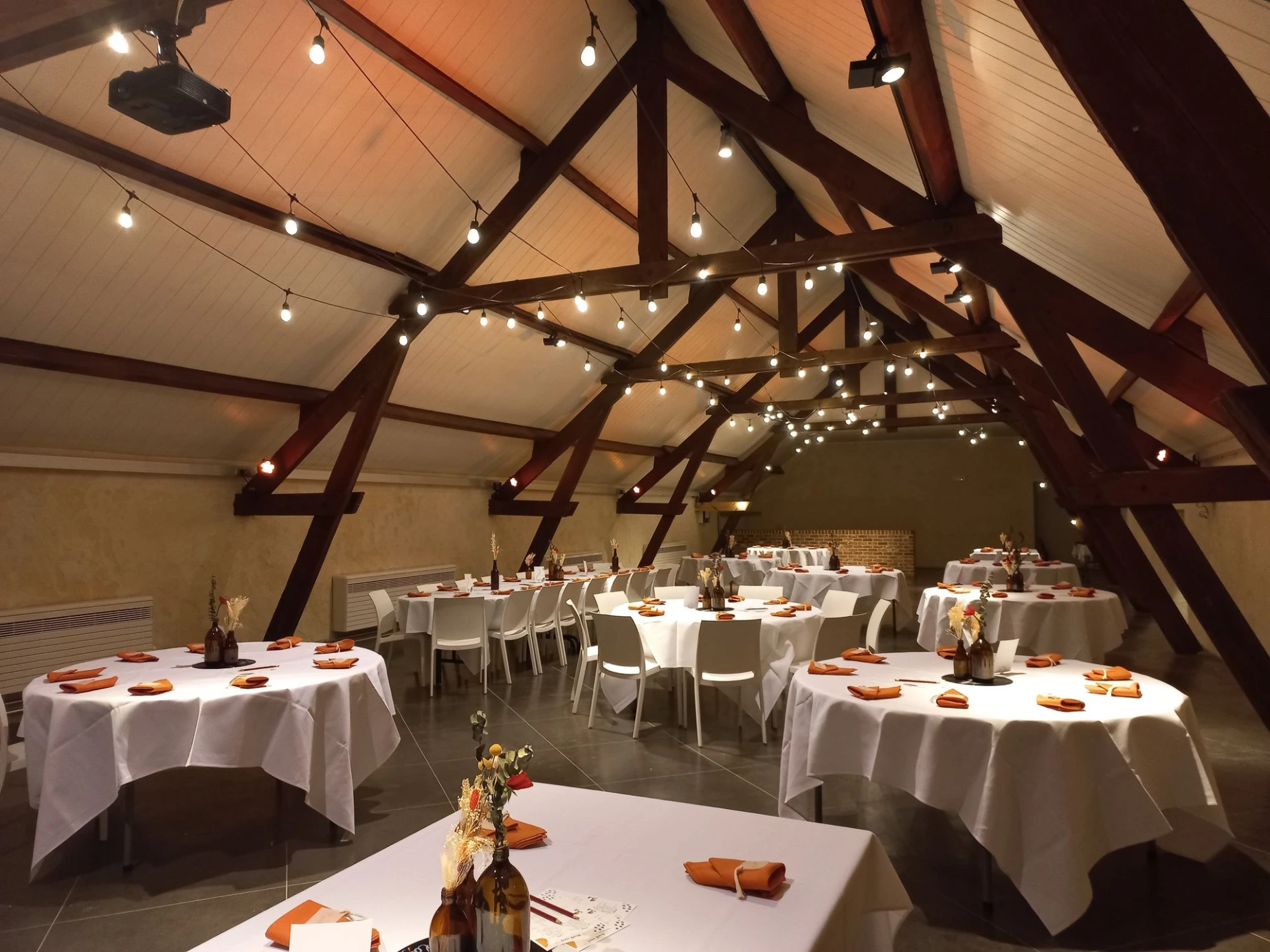 A l'étage, un rétroprojecteur, un écran de projection, des micros sans fil, des baffles et des spots de couleur vous permettent de créer une atmosphère