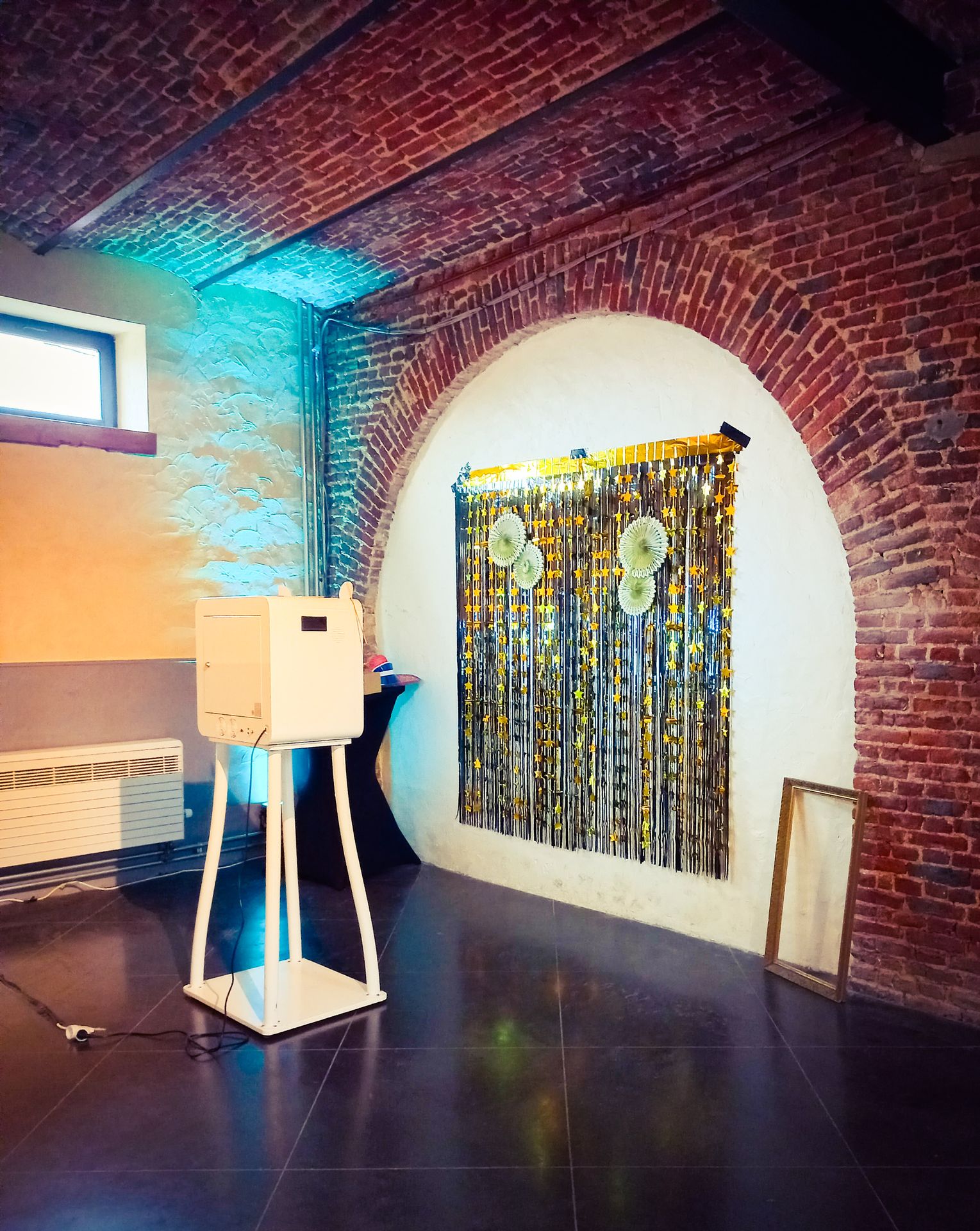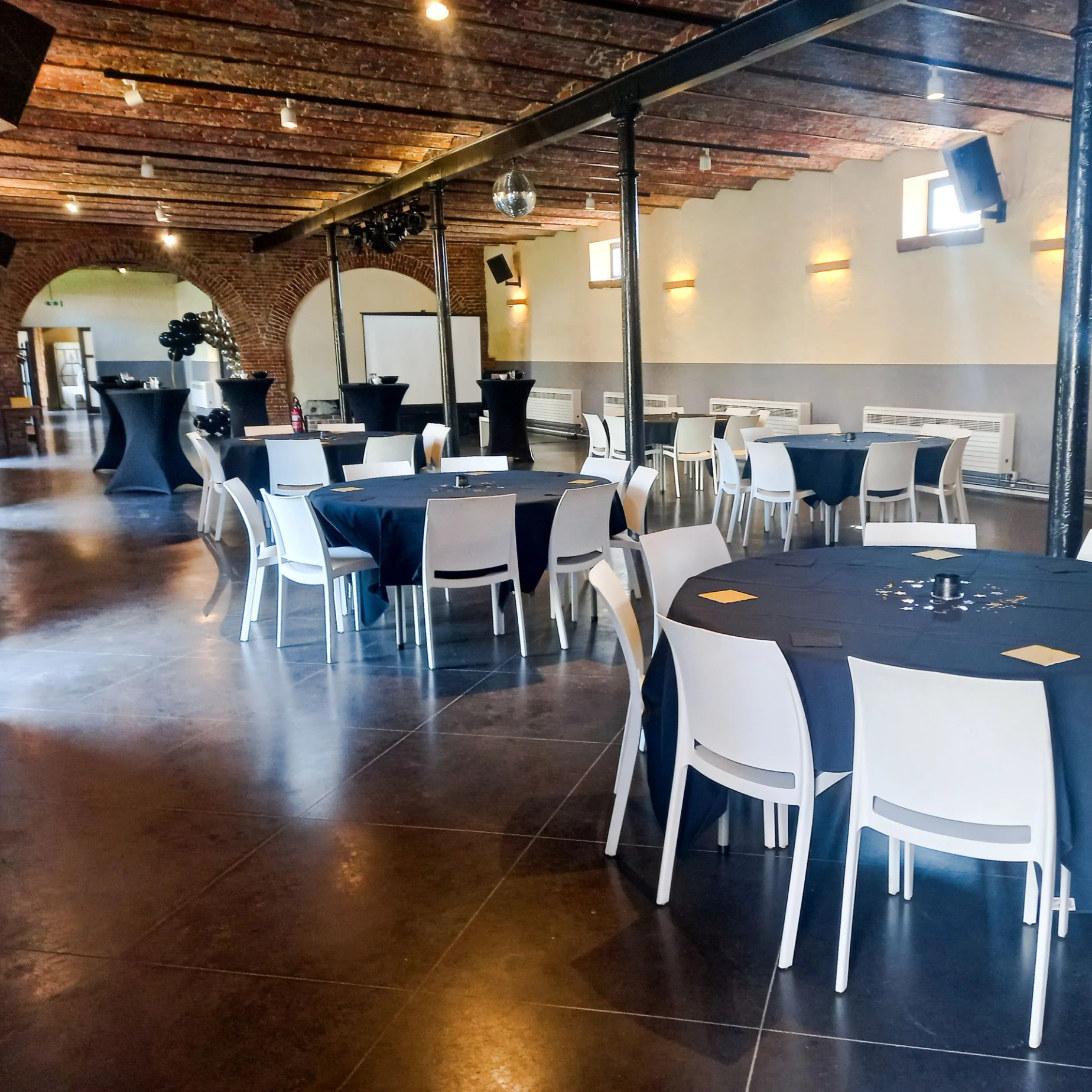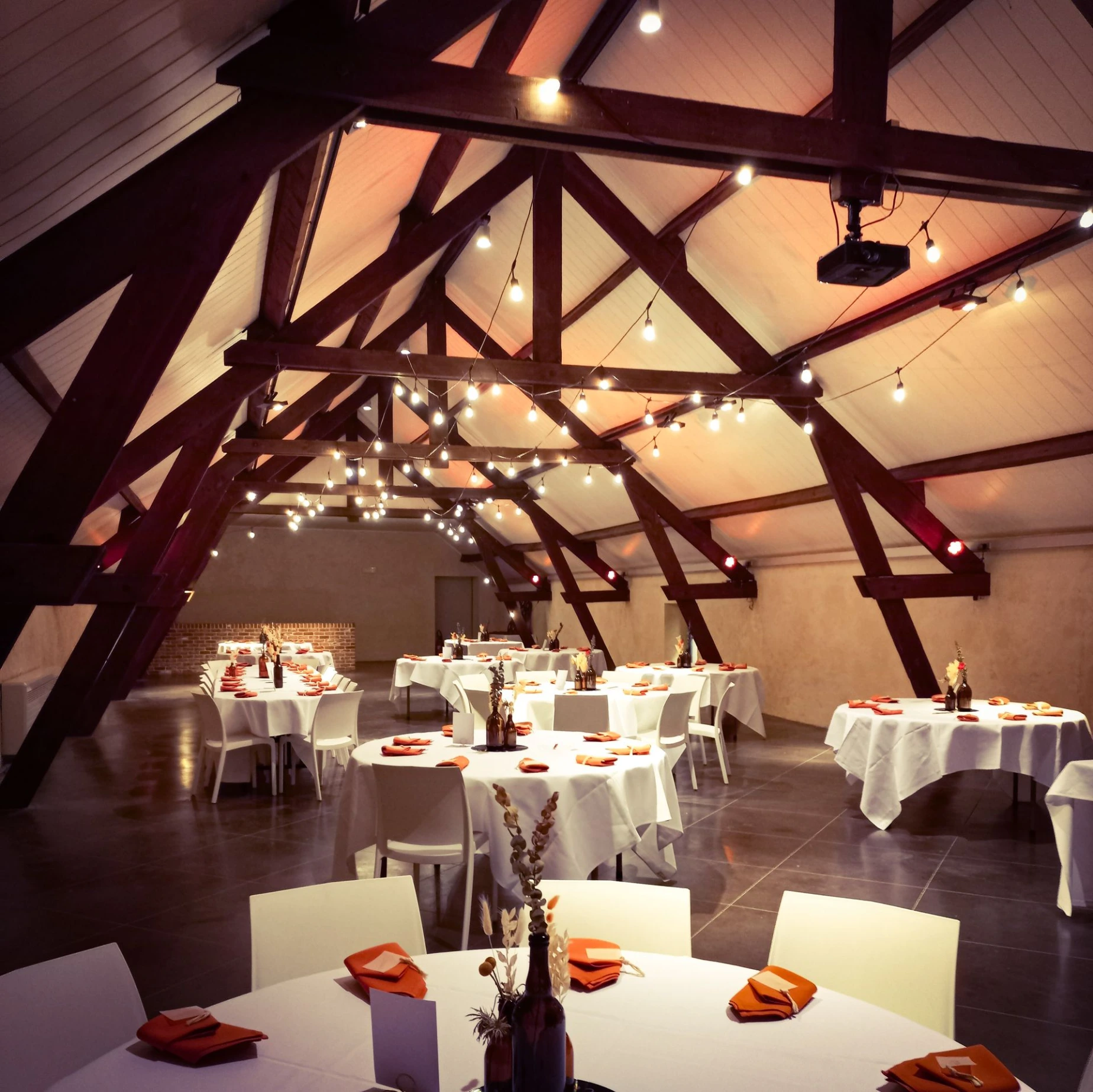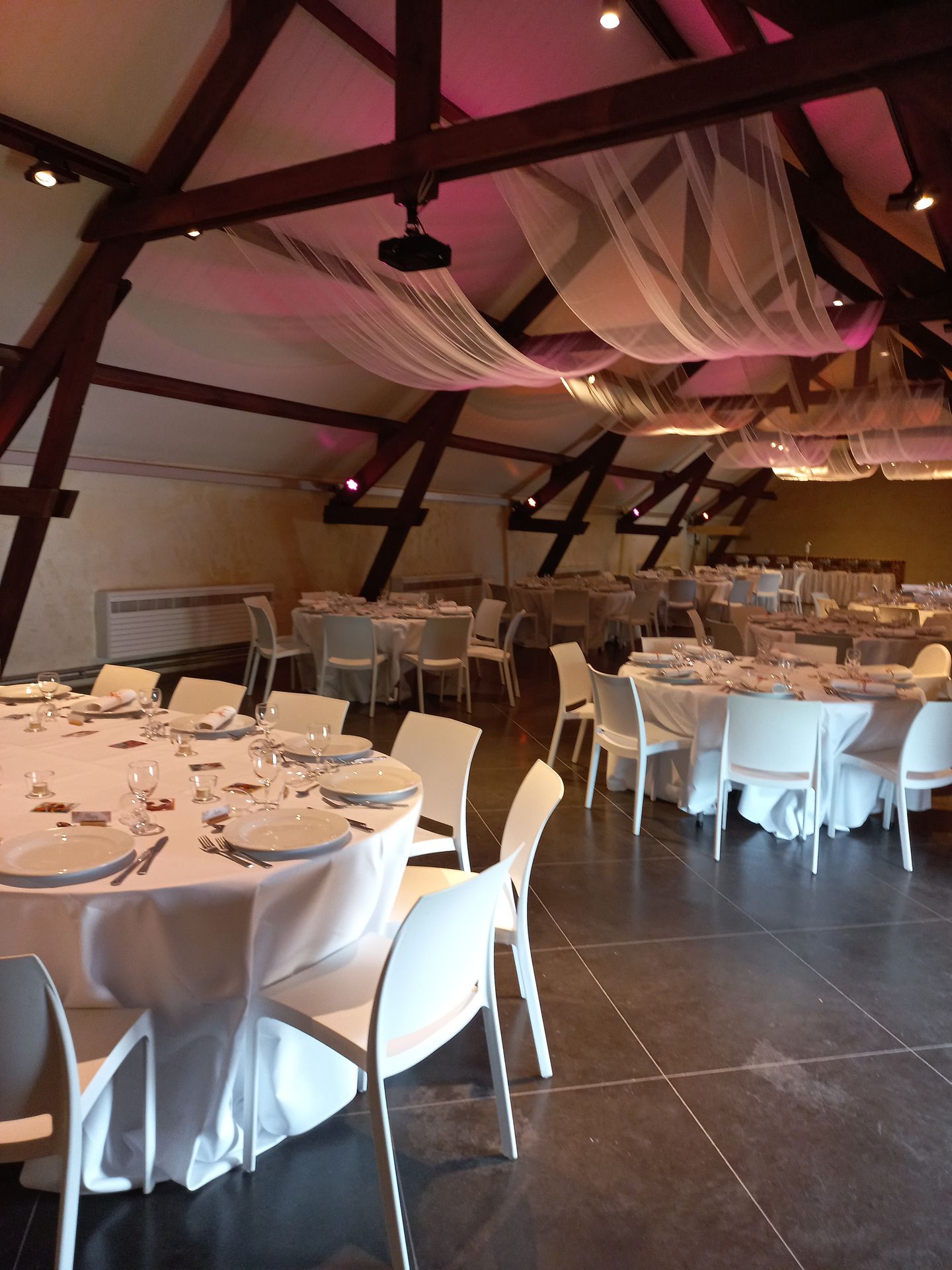 A l'étage, un rétroprojecteur, un écran de projection, des micros sans fil, des baffles et des spots de couleur vous permettent de créer une atmosphère